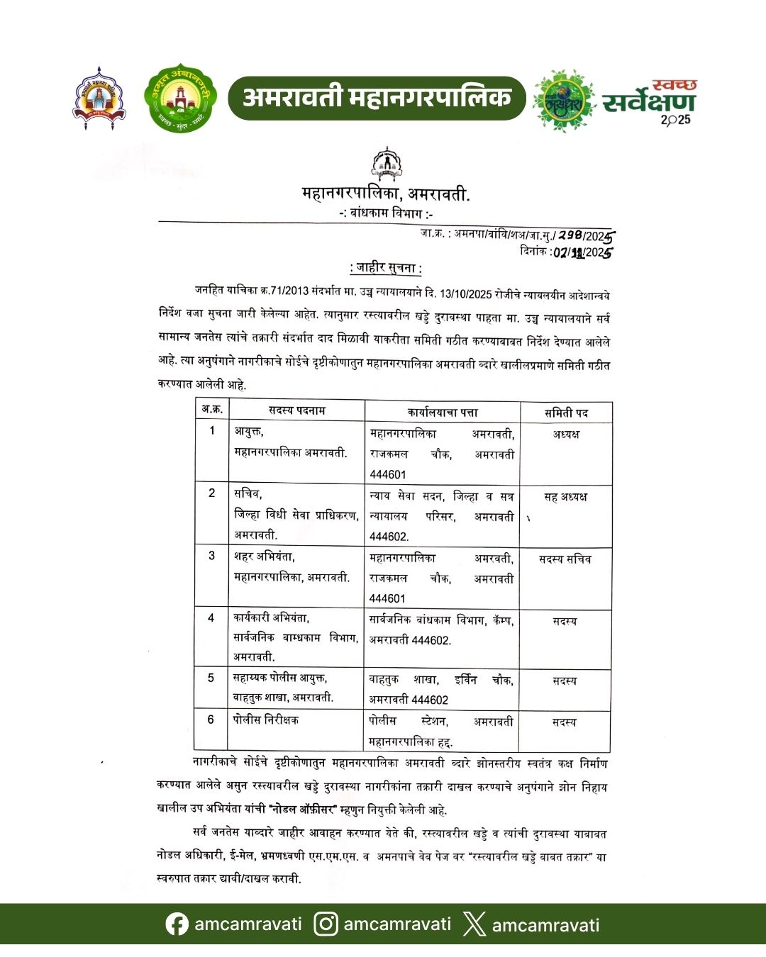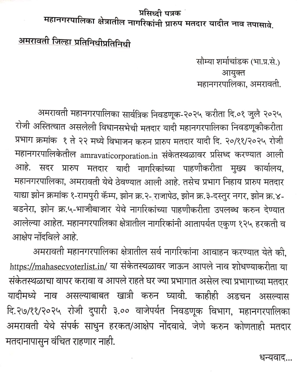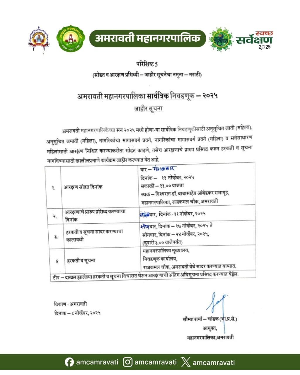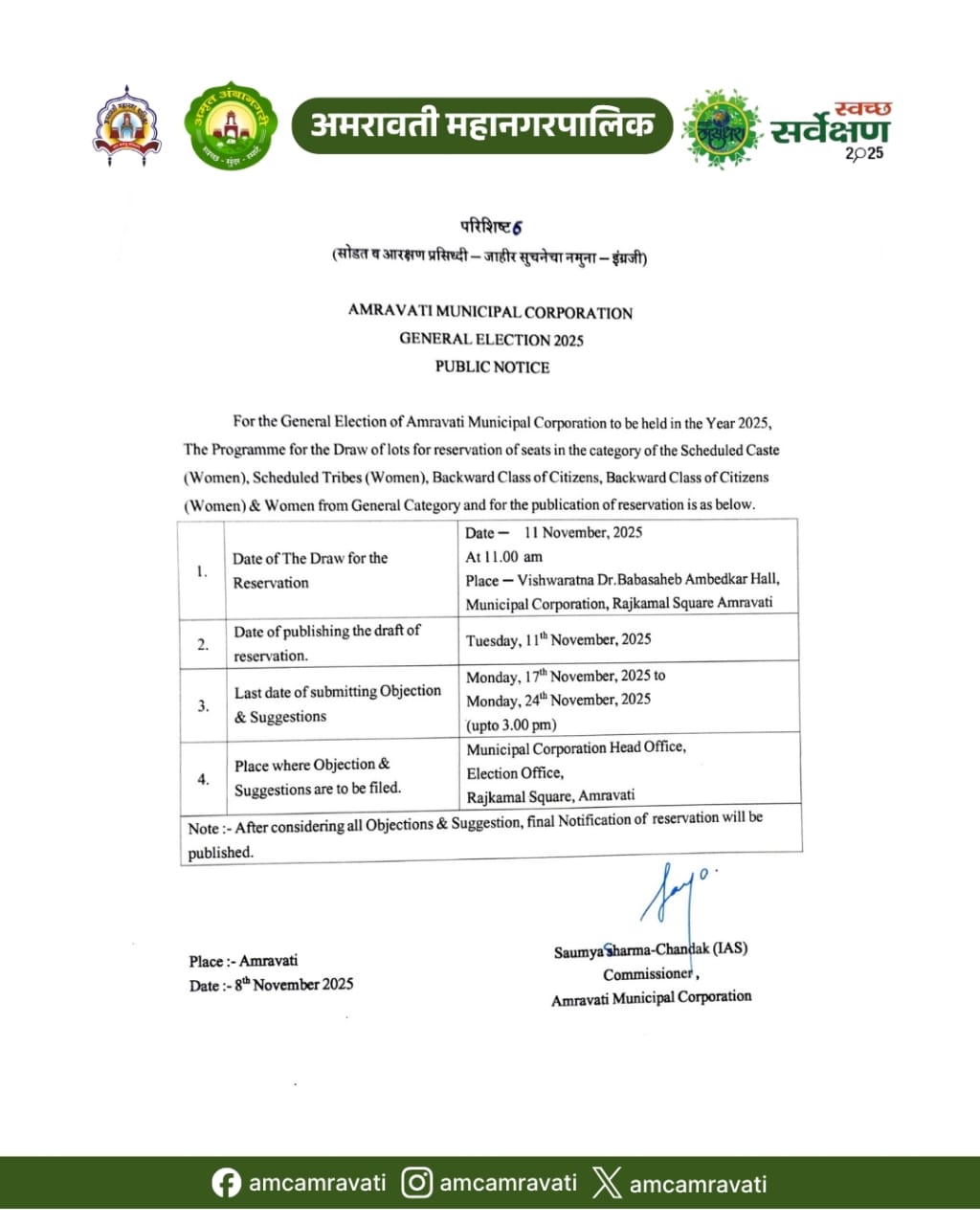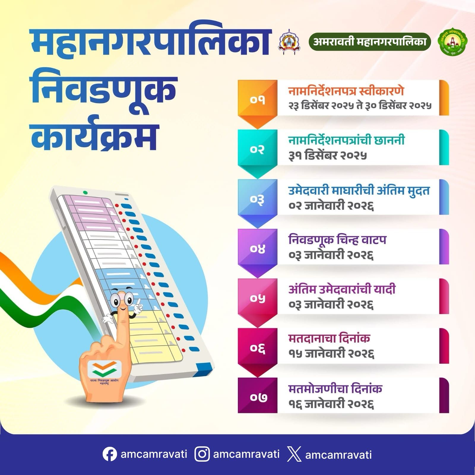 अमरावती महानगरपालिकेच्या सार्वत्रिक निवडणुकीनंतरची विशेष सभा शुक्रवार, दिनांक ६ फेब्रुवारी २०२६ रोजी दुपारी १.०० वाजता विश्वरत्न डॉ. बाबासाहेब आंबेडकर सभागृह, अमरावती महानगरपालिका येथे संपन्न झाली.