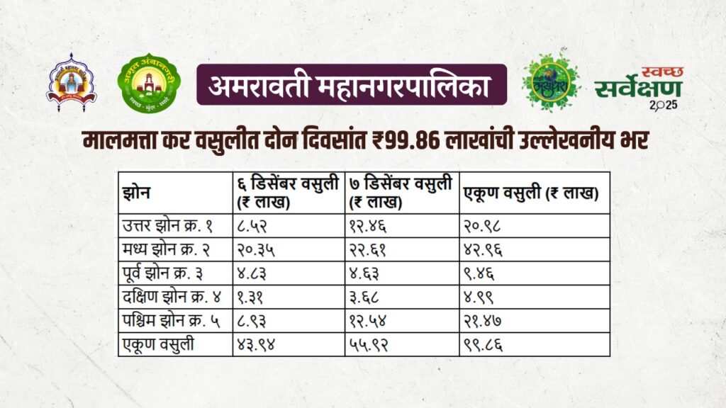 अमरावती महानगरपालिकेतर्फे शहरातील विविध प्रभागांमध्ये आयोजित करण्यात आलेल्या मालमत्ता कर वसुली शिबिरांना नागरिकांकडून मोठा प्रतिसाद मिळत असून, केवळ दोन दिवसांत एकूण ₹९९.८६ लाखांची प्रभावी वसुली नोंदवण्यात आली आहे. ६ डिसेंबर रोजी आयोजित विशेष वसुली शिबिरात उत्तर झोन क्र.१ मधून ₹८.५२ लाख, मध्य झोन क्र.२ मधून ₹२०.३५ लाख, पूर्व झोन क्र.३ मधून ₹४.८३ लाख, दक्षिण झोन […]