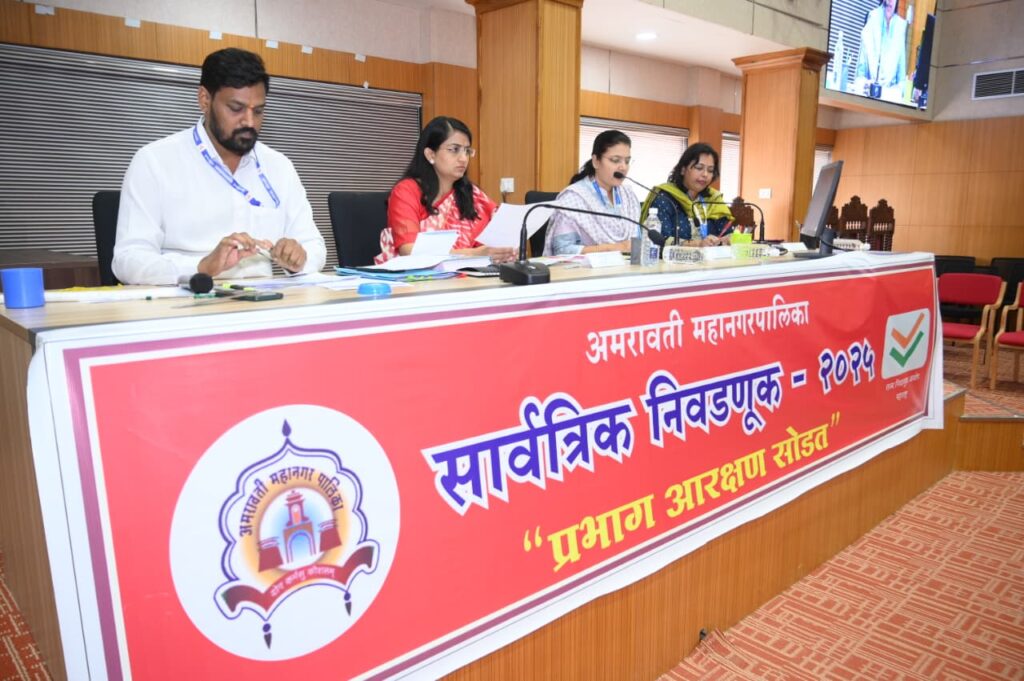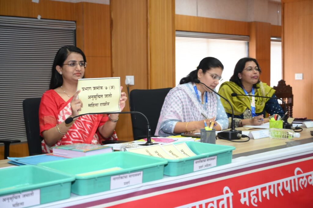 मा. राज्य निवडणूक आयोग, महाराष्ट्र यांचे संदर्भाधीन पत्रानुसार अमरावती महानगरपालिका सार्वत्रिक निवडणूक २०२५ करिता मागासवर्ग प्रवर्ग (महिला) तसेच सर्वसाधारण महिलांसाठी आरक्षित जागा निश्चित करण्यासाठी सोडतीचा कार्यक्रम आज दि. ११ नोव्हेंबर २०२५ रोजी सकाळी ११.०० वाजता विश्वरत्न डॉ. बाबासाहेब आंबेडकर सभागृह, महानगरपालिका, अमरावती येथे पार पडला.