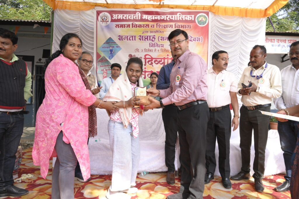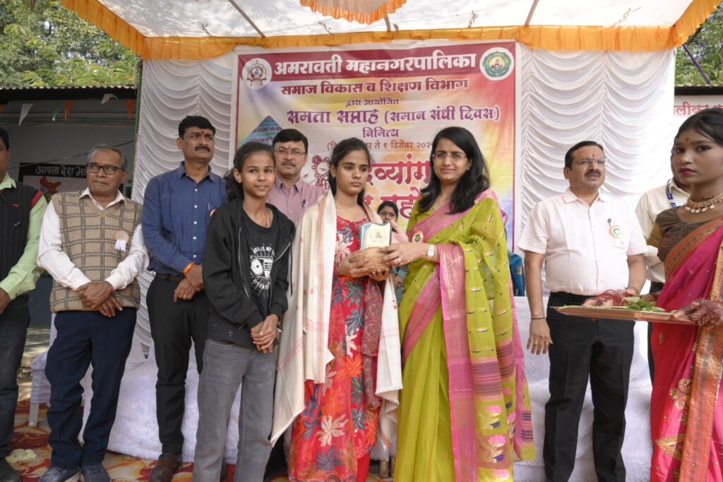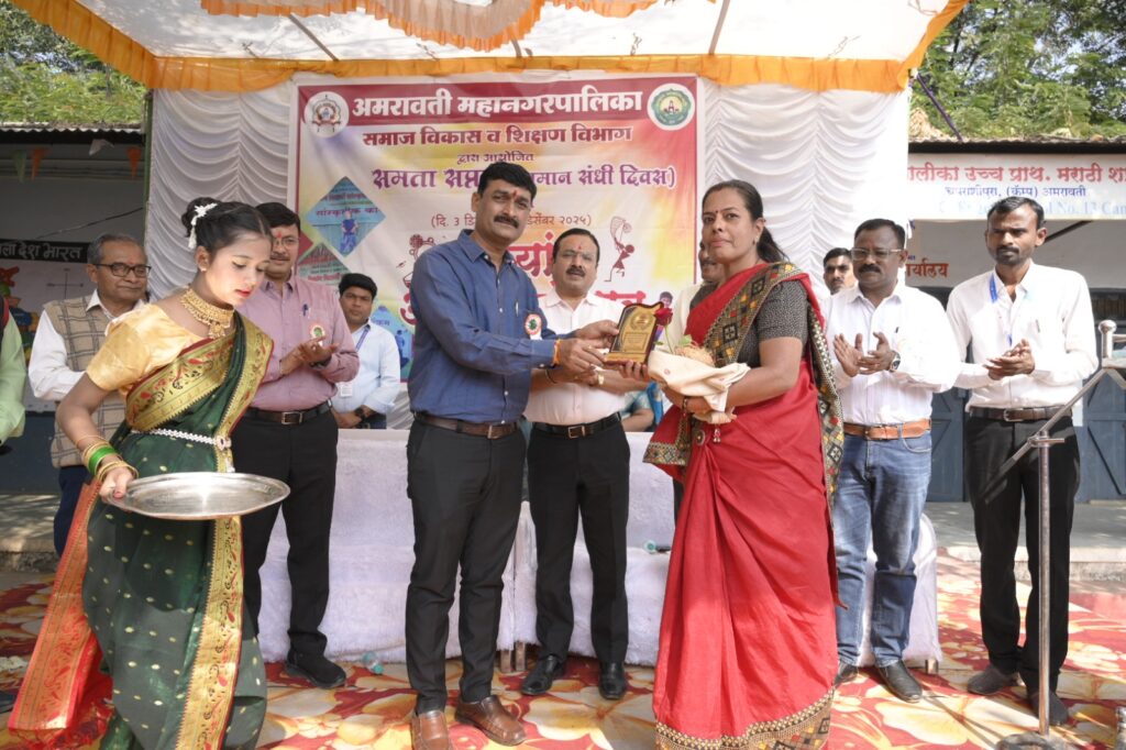 अमरावती महानगरपालिका समाज विकास विभाग आणि शिक्षण विभाग यांच्या संयुक्त विद्यमाने समता सप्ताह निमित्त आयोजित “दिव्यांग आनंद महोत्सव” अत्यंत उत्साहात आणि सामाजिक बांधिलकीच्या वातावरणात पार पडला. महानगरपालिका उच्च प्राथमिक मराठी शाळा क्र. १३, चपराशीपुरा येथे झालेल्या या कार्यक्रमाचे उद्घाटन आयुक्त सौम्या शर्मा चांडक यांच्या प्रमुख उपस्थितीत झाले, तर महेश देशमुख, नरेंद्र वानखडे, योगेश पिठे, डॉ. प्रकाश मेश्राम आणि धनंजय शिंदे यांसह मान्यवरांनी उपस्थित राहून कार्यक्रमाला विशेष ऊर्जाभर दिली.
